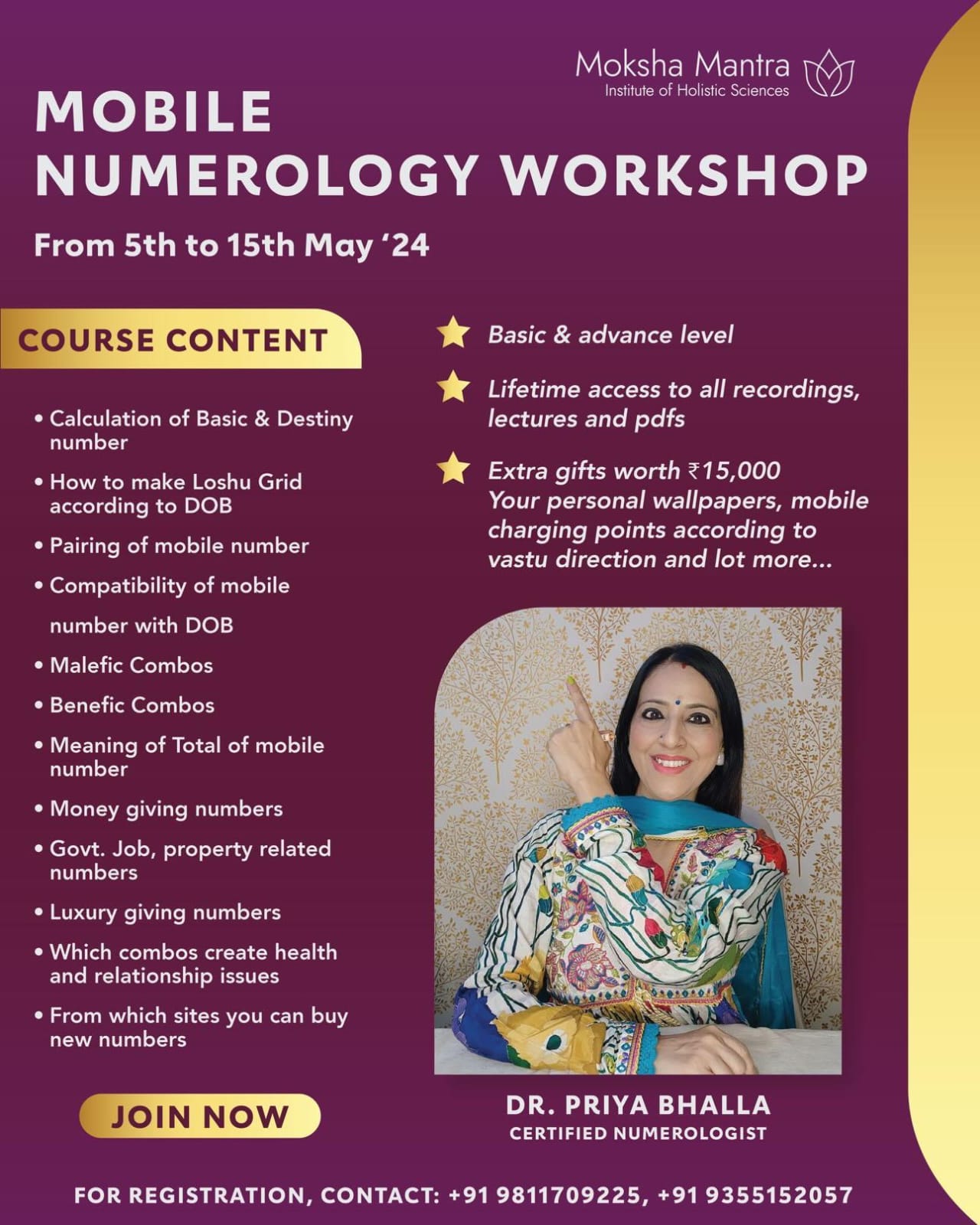 Mobile Numerology Workshop* 💫Mobile Numerology Course (Basic &Advance) ⭐You will get lifetime access to all the recording lectures and pdf’s ⭐Extra gifts worth Rs 15000 Your personal wallpapers,mobile charging points according to vastu direction and lot more… ⭐Course Content – * Calculation of Basic & Destiny number * How to make Loshu Grid according to DOB * Pairing of mobile number * Compatibility of mobile number with DOB * Malefic Combos * Benefic Combos * Meaning of Total of mobile number * Money giving numbers * Govt. Job, property related numbers * Luxury giving numbers * Which combos create health and relationship issues * From which sites you can buy your new number👍🏻